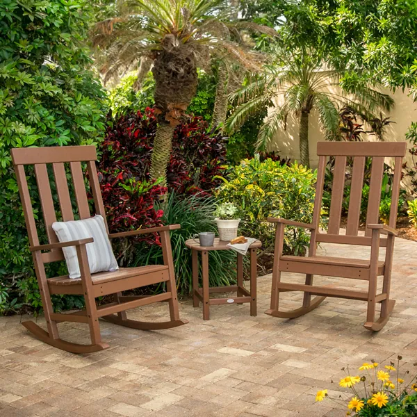 Rocking chairs come in both natural materials, such as pine or acacia wood, as well as synthetic ones like polypropylene and wicker that have been treated for UV ray protection against sun damage and moisture, with some featuring protective feet to safeguard hardwood patio flooring.
