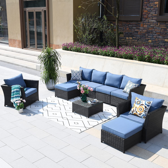 This wicker patio furniture set has become a customer favorite with over 12,000 reviews, thanks to its contemporary design that seamlessly marries modern aesthetics and organic charm. This set features a loveseat, two chairs, and an ottoman which can be configured in various ways depending on your individual needs.